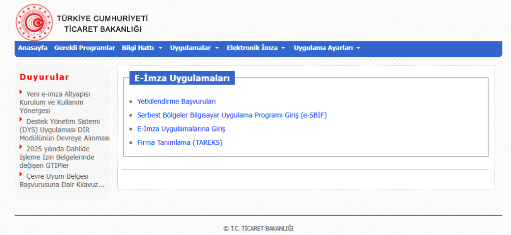 Başvuruların elektronik ortamda yapılabilmesi için 27/12/2017 tarihli Resmi Gazete’de yayımlanan İthalat İşlemlerinde Elektronik Başvuru Sistemi Tebliği (İthalat: 2017/3) ile başlanan ve 4/7/2021 Tarihli Resmi Gazetede yayımlanan İthalat İşlemlerinde Elektronik Başvuru Sistemi Tebliği (İthalat: 2021/21) yenilenen sistem ile kişilerin firmalar adına yetkilendirilmesi ve yetkili kişilerin de başvurularını Bakanlığın (www.ticaret.gov.tr) adresinde yer alan E-İmza Uygulamaları bölümünde yer alan “İthalat Belge İşlemleri”nden yapılması gerekmektedir.