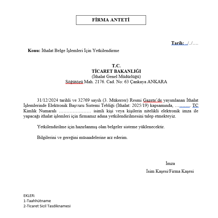 (31.12.2024 Tarih ve 32769 sayılı 3. Mükerrer Resmi Gazetenin 813. Sayfasında yayımlanan Ticaret Bakanlığı “İthalat İşlemlerinde Elektronik Başvuru için Yetkilendirme Tebliği.(İTHALAT :2025/19)