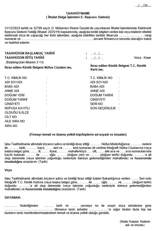 Yukarıda tanımlanan internet sayfasındaki “Uygulamalar->İthalat Belge İşlemleri->Taahhütname Örneği” linkinde alan örneğe uygun, firmayı temsil ve ilzama yetkili kişi veya kişilerce imzalanmış ve Türkçe olarak noterde her bir kişi için düzenlenmiş taahhütname.
